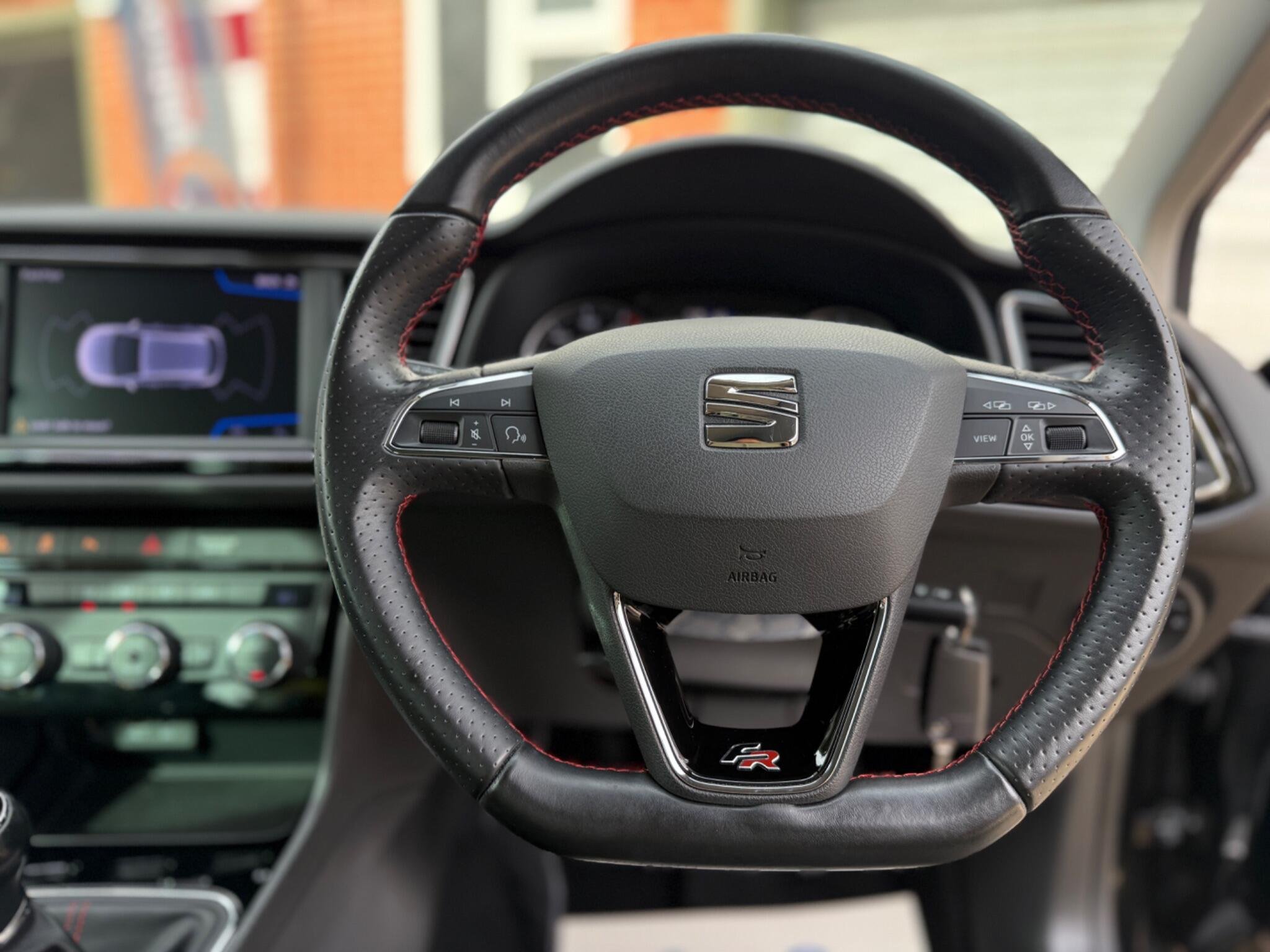 - Steering Wheel - Flat-Bottomed Perforated Leather with Red Stitching and FR Logo